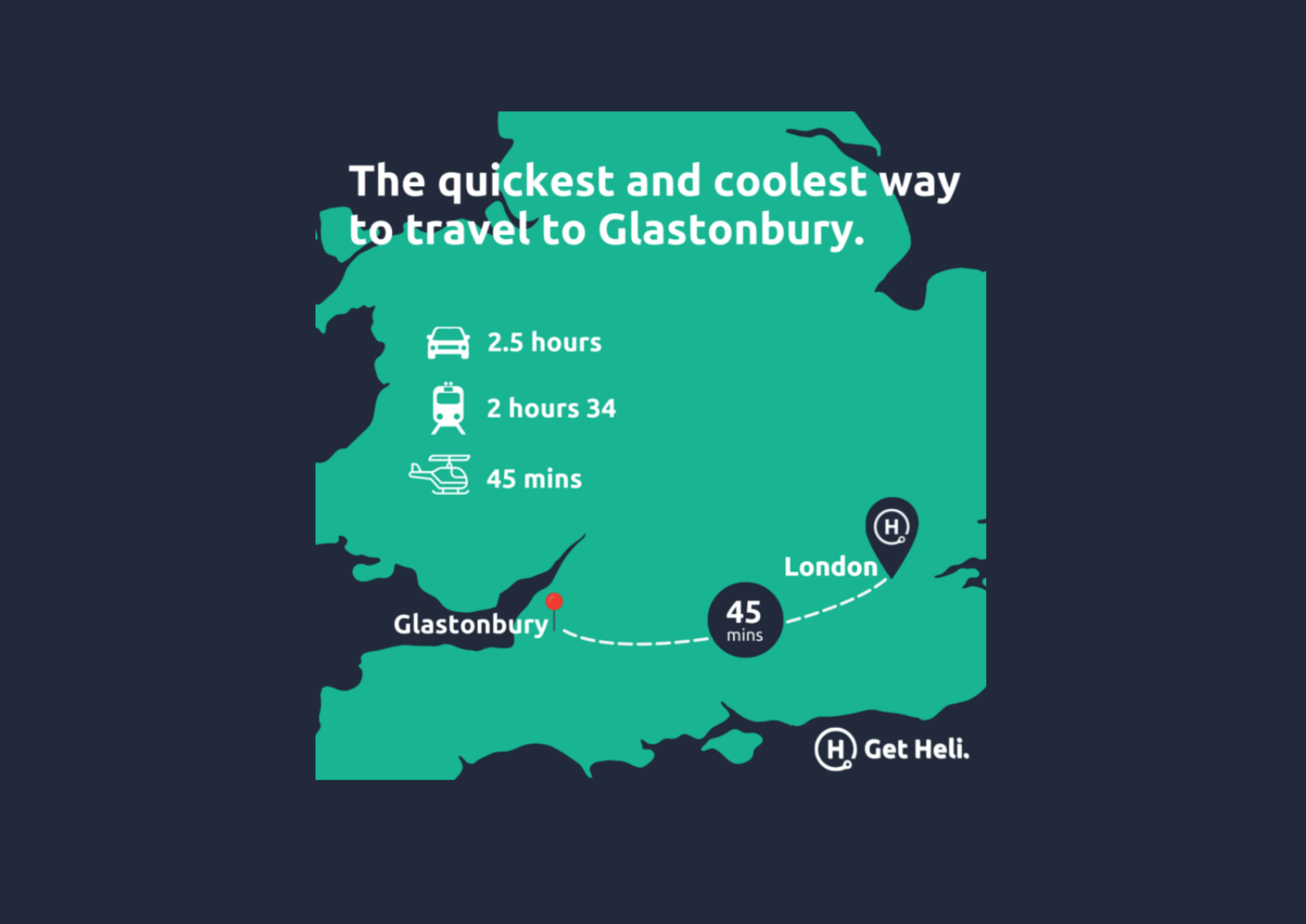 The helicopter flight takes 45 mins to 1 hour (depending on the wind on the day of the flight) from the Glastonbury helipad to The London Heliport in London Battersea.